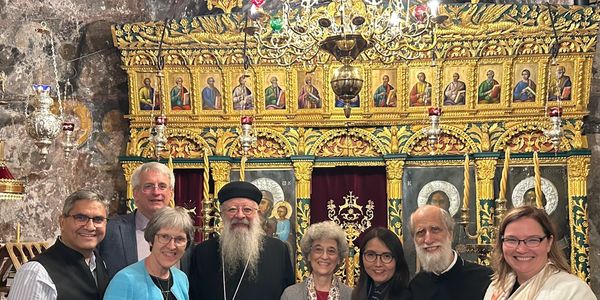 In this November 2025 image is shown the chapel for Vespers during the 6th Patriarchate Network International Conference on Pastoral Health held in Rhodes, Greece. Shown here is Network Founder and Convenor, Protopresbyter of the Ecumenical Throne, Father Stavros and Mrs. Kofinas, and presenters from the WCC Commission on Health and Healing including Rev. Dr. Peter Kuhnert, along with Rev. Karen Kuhnert.